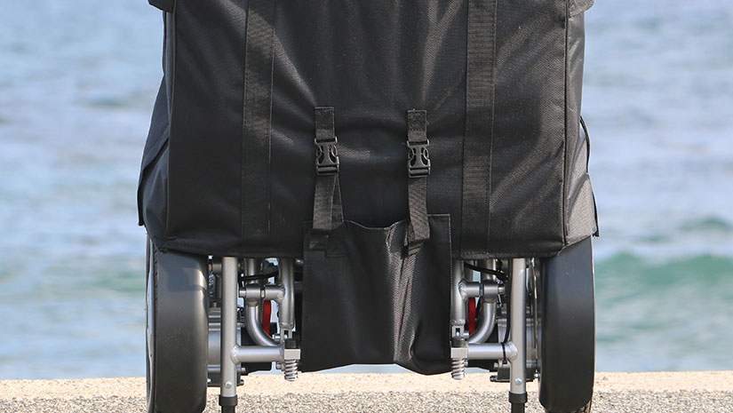 Husa nu este căptușită și este fabricată din nailon durabil și rezistent la rupere. În poziția pliat, puteți glisa cu ușurință husa peste Eloflex și o puteți fixa cu cataramele de sub scaun. Cele două mânere de pe capac facilitează rularea scaunului pe propriile roți.